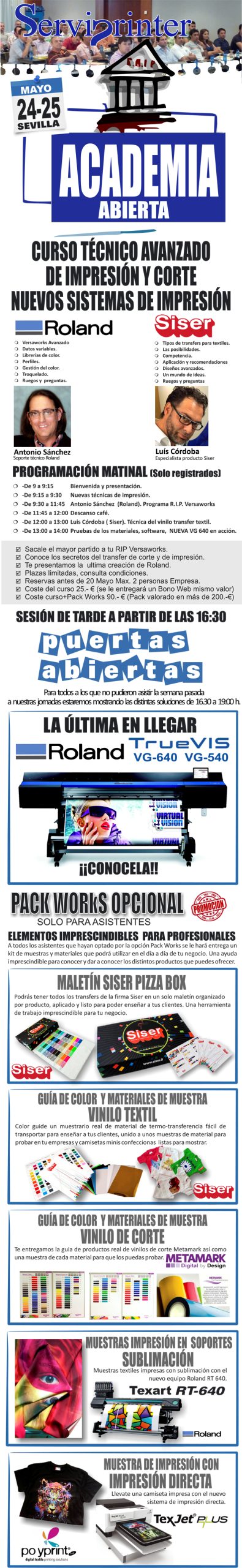 Bienvenidos a la ACADEMIA abierta que Serviprinter pone a tu disposición como cliente exclusivo los días 24 o 25 de mayo, si tienes inquietudes y ganas de mejorar e innovar como profesional del sector textil y rotulación, no dejes escapar esta oportunidad que te brindamos para aprender y expandir tus conocimientos de la mano de los expertos.