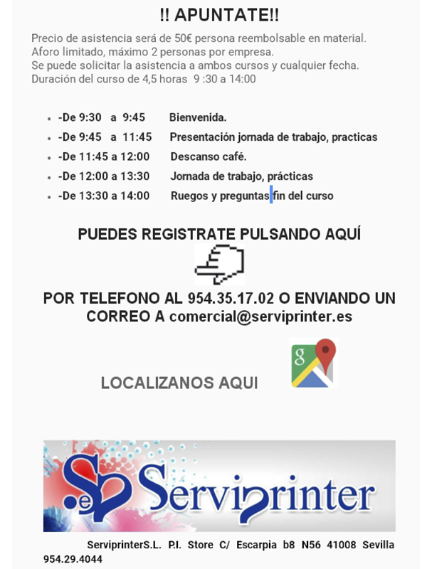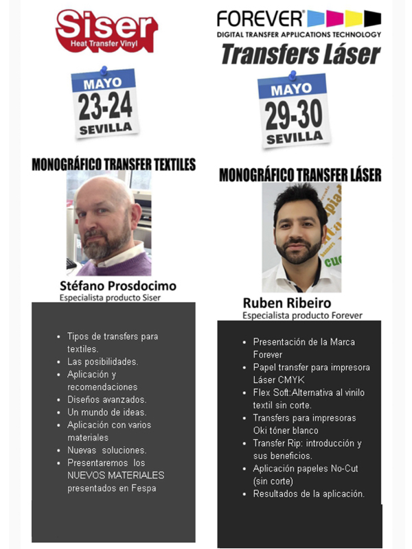 Este año tenemos previsto revisar los materiales Siser y presentar las novedades de Fespa Alemania. Hacer prácticas de planchado y realizar algún trabajo real. Para Forever utilizaremos una impresora láser a color con tóner blanco y realizaremos practicas en textil personalizados. Todas estas muestras y trabajos os las podréis llevar para mostrar a vuestros clientes.