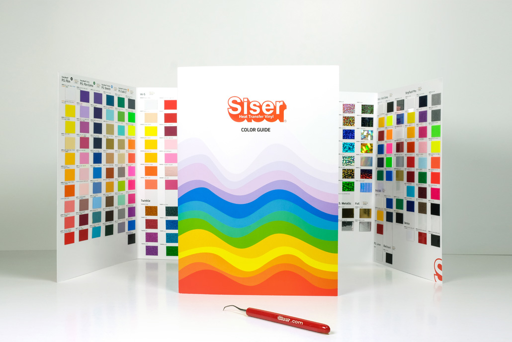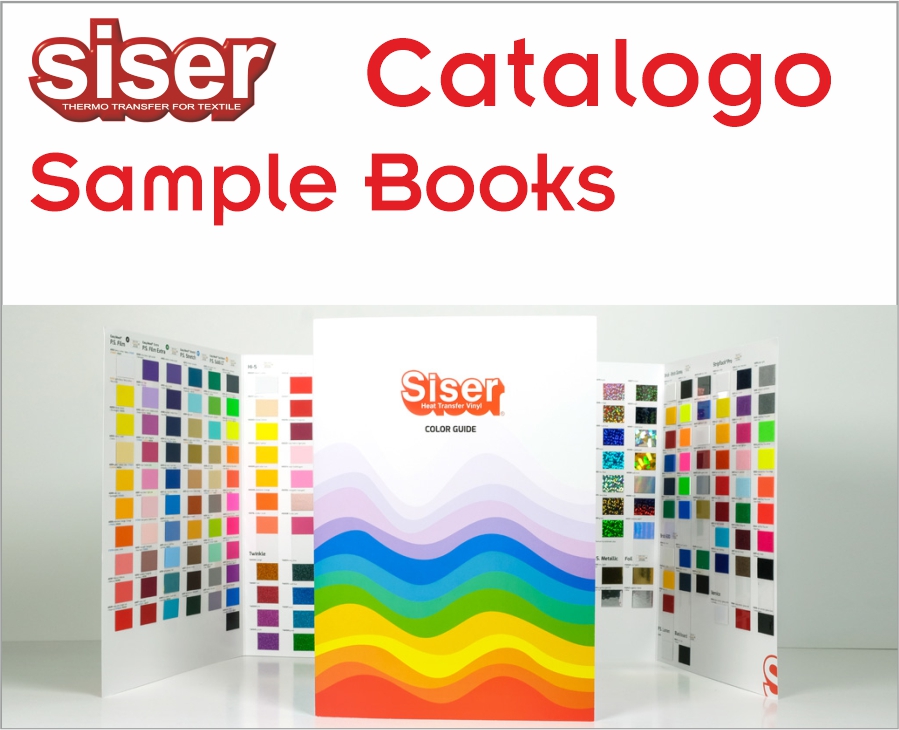 Carta de color y tipo de transfer textil Siser con muestras reales de toda la gama de productos. confeccionado en un practico tríptico donde tenemos organizada la lista y muestras del material.