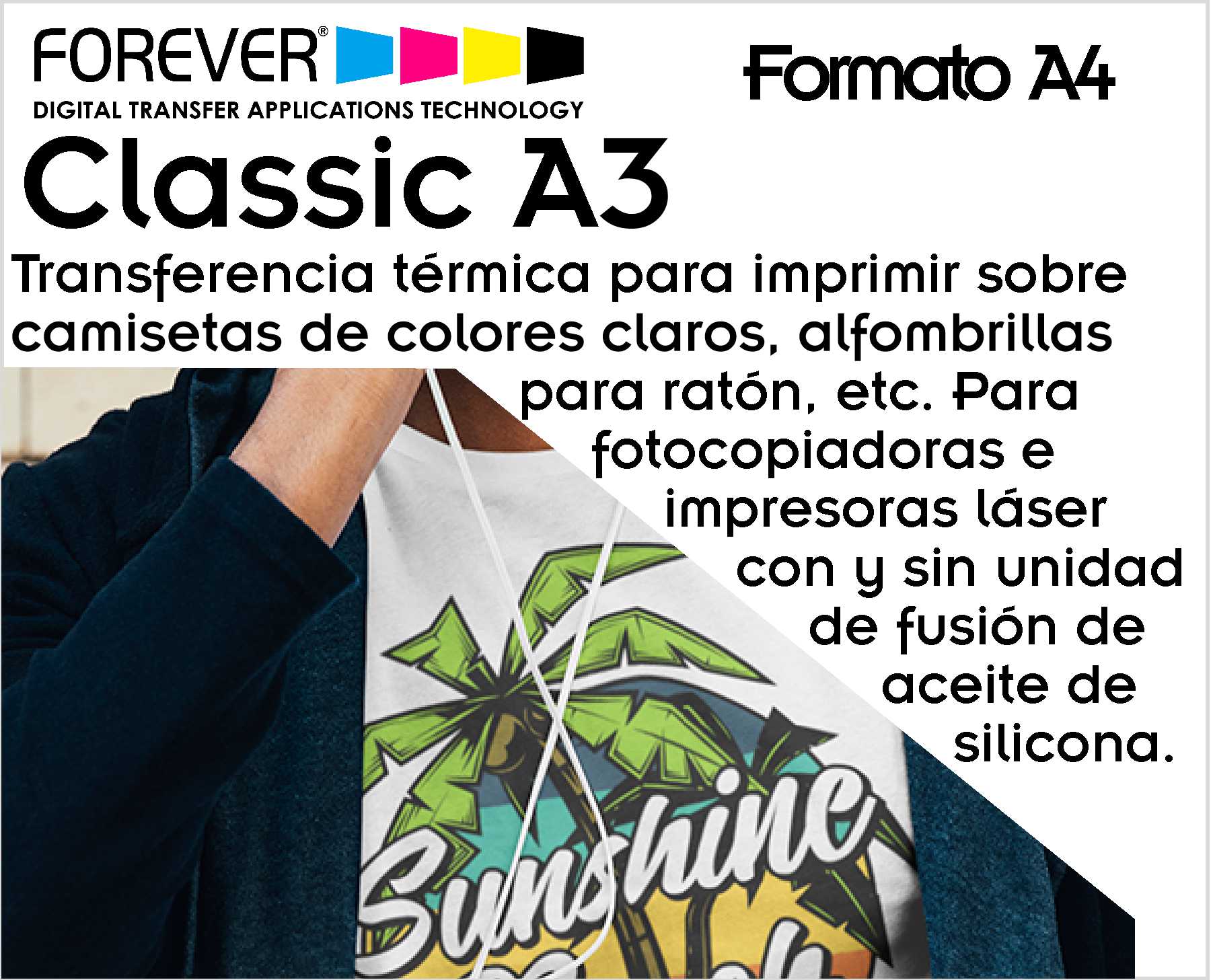 Papel de transferencia para imprimir sobre textiles de colores claros, alfombrillas de ratón, etc. ¡FOREVER Classic es adecuado sólo para fotocopiadoras e impresoras láser a color con unidad de fusión de aceite de silicona!