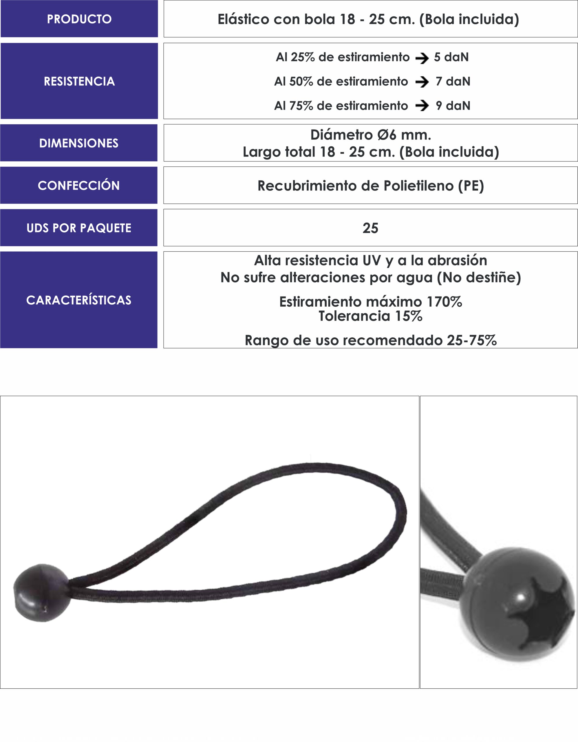 Cordón elástico con bola de plástico. Este tipo de gancho puede ser usado para fijar toldos o lonas en su soporte.