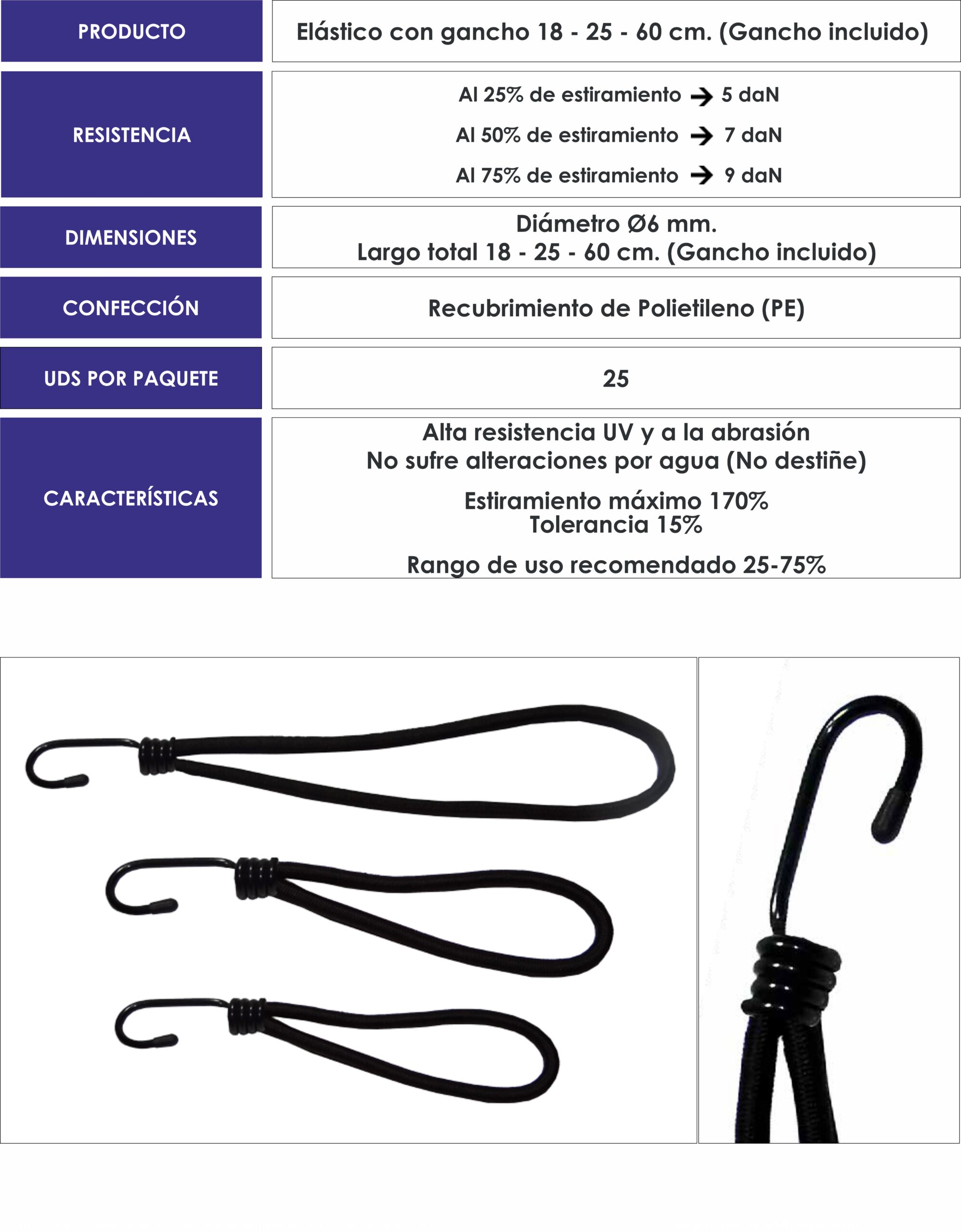 Cordón elástico con gancho metálico plastificado. Este modelo puede ser usado para fijar lonas en sus marcos o expositores.