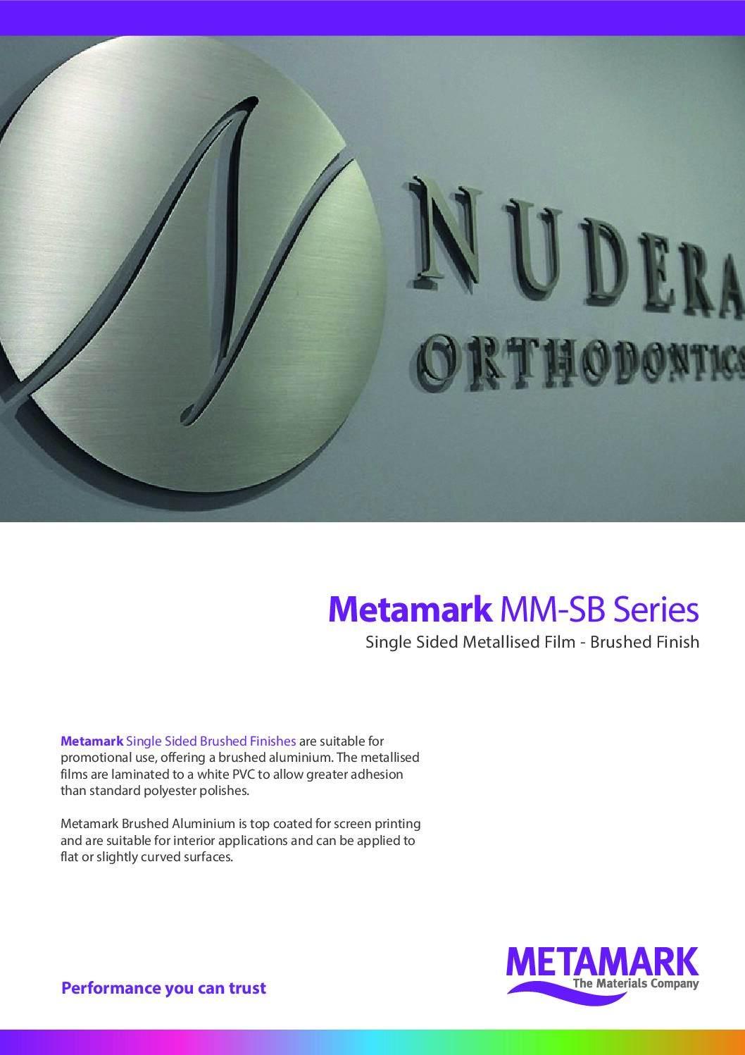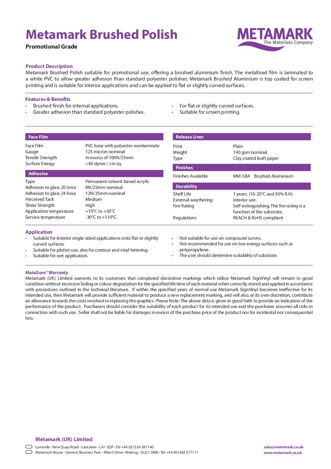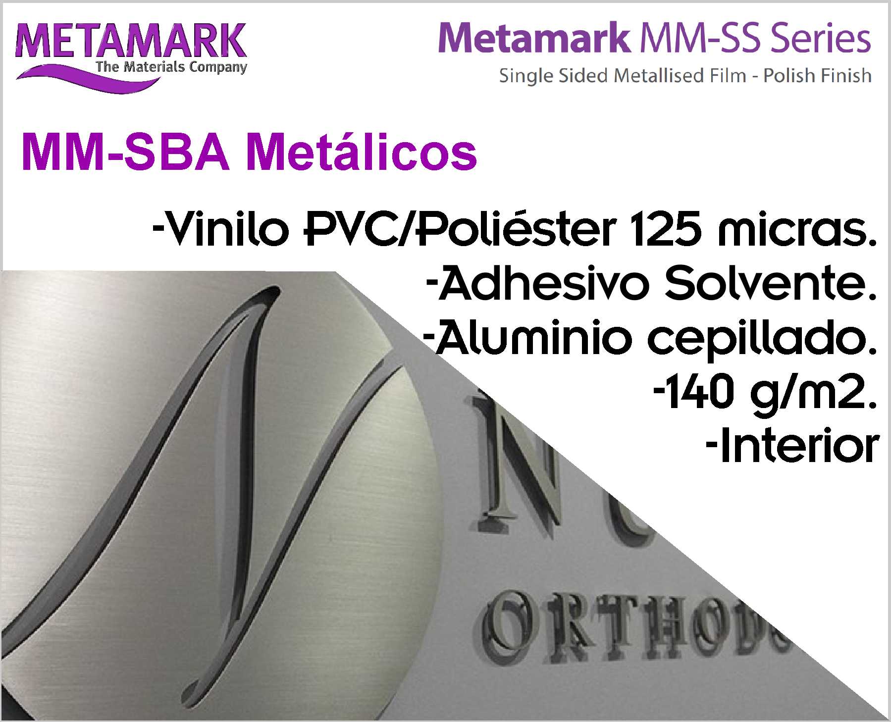 Metamark Brushed Aluminium (MM-SBA) es una película metalizada de una sola cara con un recubrimiento superior para serigrafía y es adecuada para aplicaciones interiores o exteriores de corta duración sobre superficies planas o ligeramente curvas.
