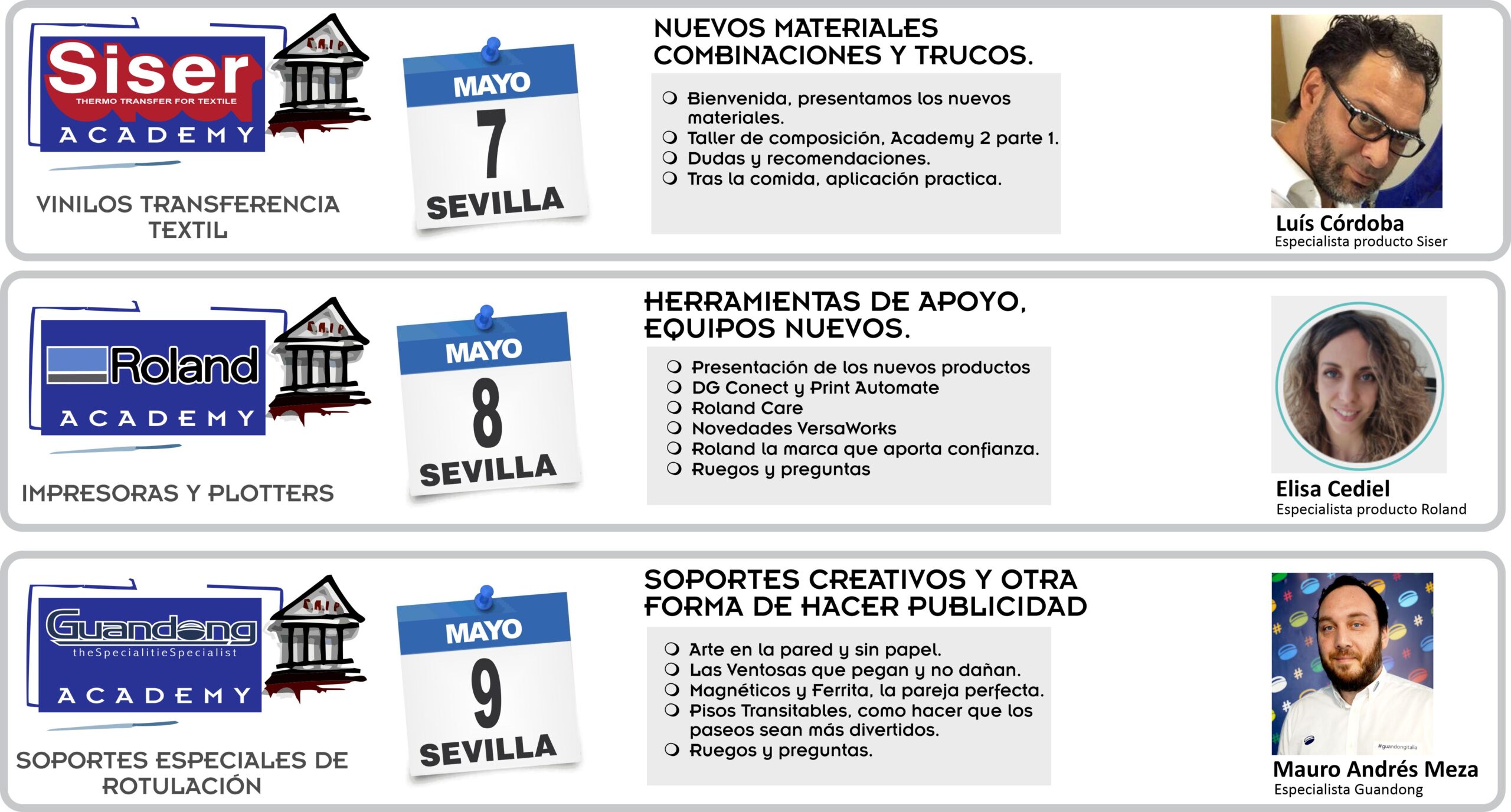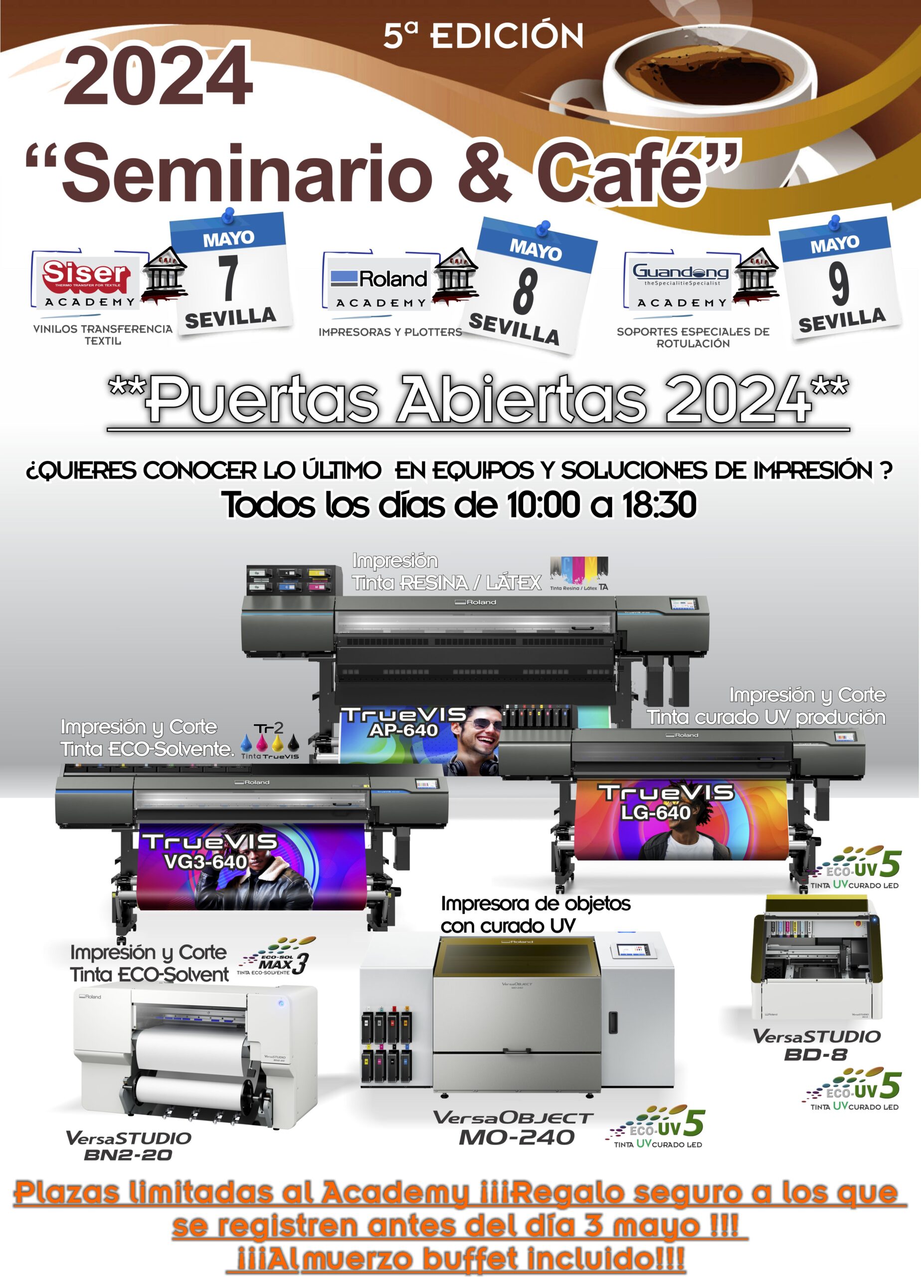 De nuevo nuestro “Seminario & Café” con el ánimo de crear cursos monográficos con objeto de compartir una mañana/tarde con nuestros clientes para aclarar, mejorar y ampliar conocimientos sobre las distintas soluciones. En esta ocasión dedicaremos las mañanas a conocer todo lo que rodea el mundo del vinilo, nuevos materiales especiales e información técnica de aplicación y adhesivos por parte de Guandong , transfers nuevas y técnicas de aplicación con los recientes vinilos textiles de corte Siser, y conoceremos de primera mano las nuevas creaciones de Roland donde por la tarde las pondremos a prueba con vosotros.